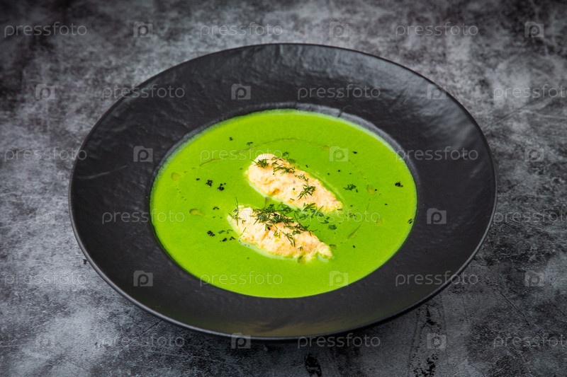 Сливочный суп из брокколи с травами на черной тарелке, вид сбоку