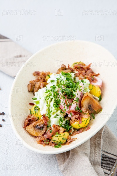 Салат с картофелем, рисом, мясом и зеленым луком, вид сверху