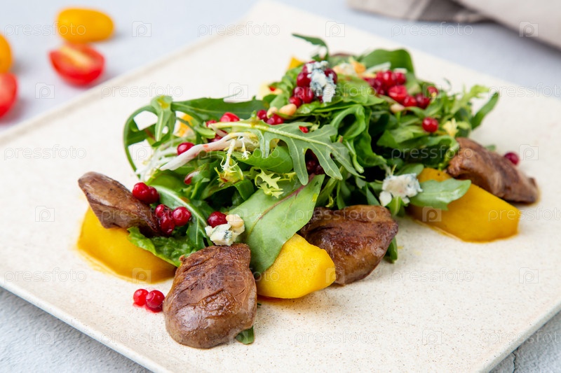 Мясные медальоны с рукколой, ломтиками персика и красными ягодами, вид сбоку