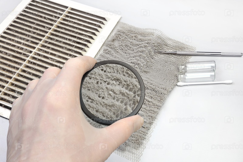 Вентиляционная решетка покрыта пылью. Осмотр пыли под лупой