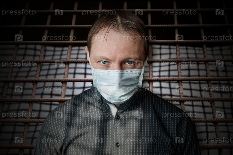 Вирусная эпидемия. Понятие о бактериологической опасности, болезни. Мужчина в медицинской маске на фоне металлических стержней. Китайский коронавирус или грипп