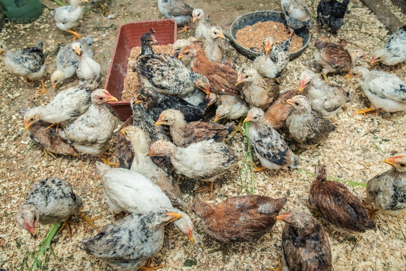 Кормление кур в деревне. В помещении, в деревенском сарае, растут птицы