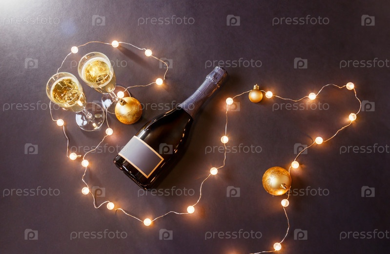 Бокалы шампанского, бутылка шампанского, рождественские шары и светящиеся рождественские огни на темном фоне