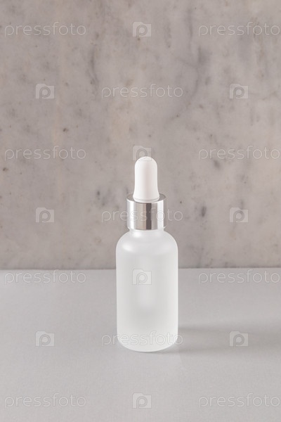 Косметическая матовая бутылка с капельницей для презентации продукта на фоне мраморной стены. Передний план. Пустая упаковка. макет