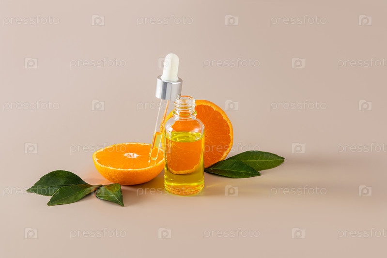 Открытый прозрачный флакон с капельницей, наполненной пипеткой естественного ухода за собой. Увлажняющая, отбеливающая сыворотка на основе экстракта мандарина