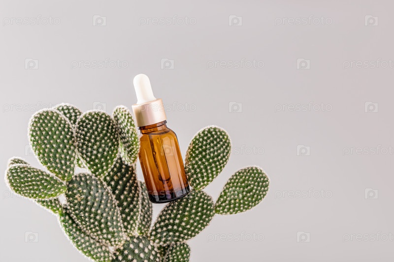 Косметическая бутылочка с капельницей с натуральным средством по уходу за кожей лица и тела среди толстых листьев кактуса. Концепция экологической натуральной косметики