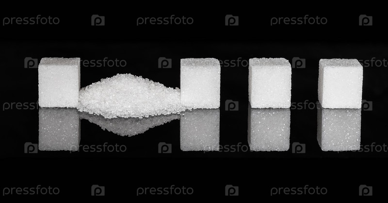 Четыре кубика рафинада с кучей сахарного песка между ними, с отражением на глянцевой поверхности. Макрофотография