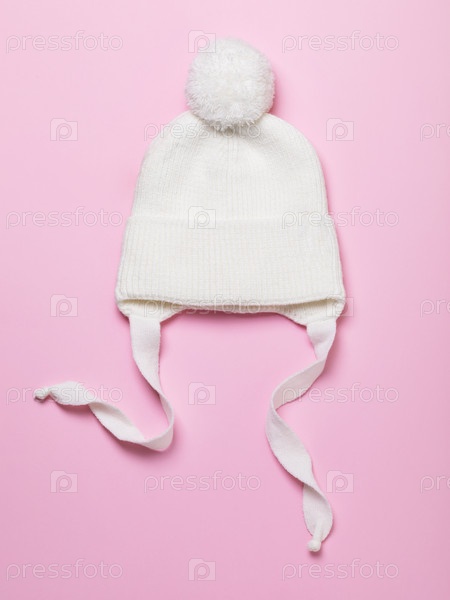 Детская вязаная шапка белого цвета на розовом фоне, вид сверху