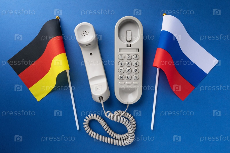 Старый телефон и два флага на синем фоне, концепция на тему телефонных разговоров между Германией и Россией