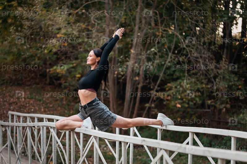 Спортсменка выполняет упражнение Эка Пада Раджакапотасана, позу голубя, тренируется, сидя на перилах деревянного пешеходного моста в теплый осенний день в парке