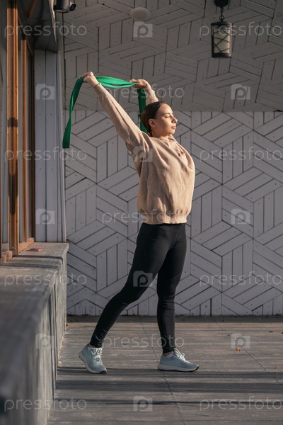 Привлекательная молодая женщина занимается спортом на улице, выполняет упражнения с фитнес-ремнем, поднимает руки вверх, прогибаясь назад, тренируется в спортивной одежде, стоя на деревянной платформе