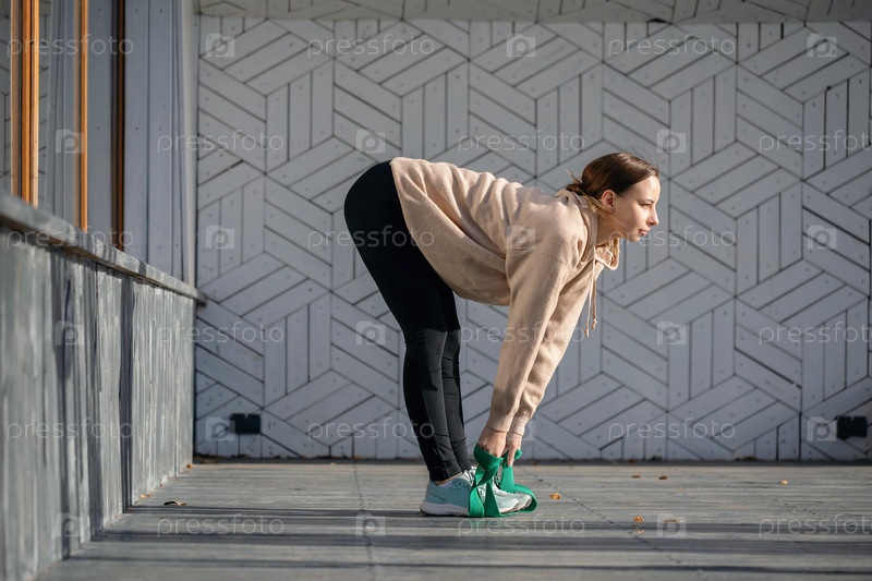 Молодая спортсменка выполняет упражнения на растяжку мышц спины и ног с помощью фитнес-ремня, тренируется в спортивной одежде, стоя на деревянной платформе солнечным утром