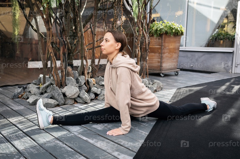Молодая спортивная шатенка занимается спортом на улице, выполняет упражнения на растяжку мышц ног, сидит в продольном шпагате, тренируется в леггинсах и свитере