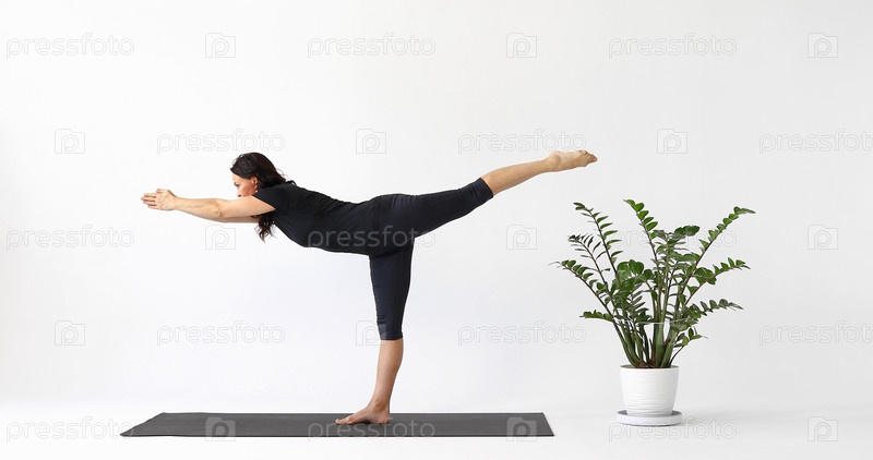 Инструктор по йоге, выполняющий упражнение Вирабхадрасана, поза воина номер три, тренирующийся в коротких леггинсах и футболке, стоящий на коврике в студии
