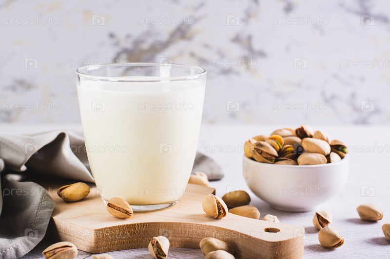 Безлактозное фисташковое молоко в стакане и орехи на столе