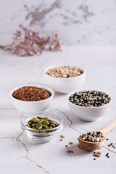 Сбалансируйте женские гормоны с помощью тыквы, льна, кунжута и семян подсолнечника, вертикальный вид