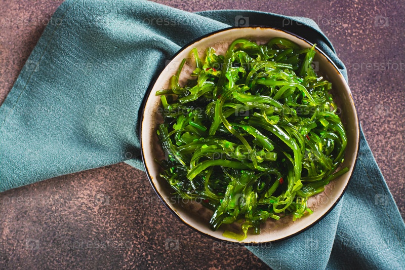 Крупный план традиционного салата из свежих морских водорослей и кунжута на тарелке на столе