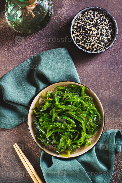 Вкусный салат из морских водорослей вакаме на тарелке и семена кунжута в миске сверху и вертикальный вид