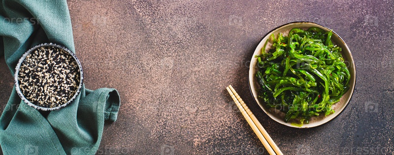 Вкусный салат из морских водорослей вакаме на тарелке и семена кунжута в миске, вид сверху веб-баннер