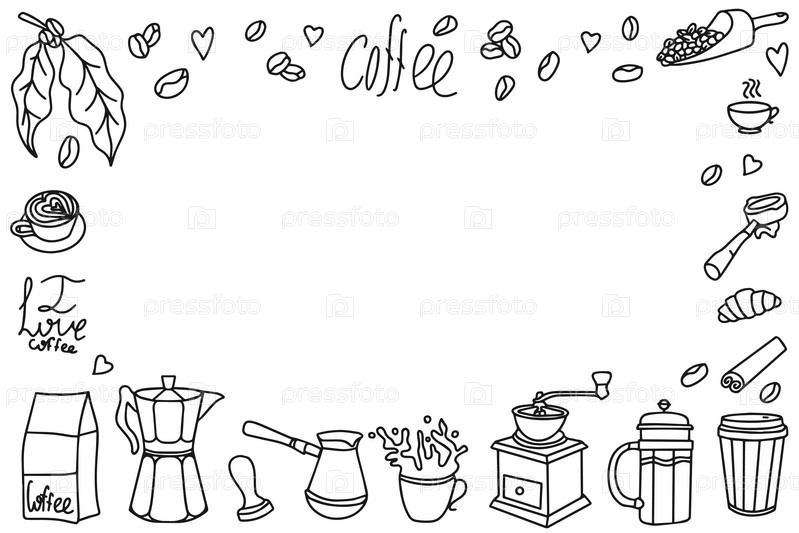 Симпатичные каракули мультяшные иконки кафе. Фон с напитками и кофейной посудой. Векторный контур рисованной кофе и пекарни для меню кафе
