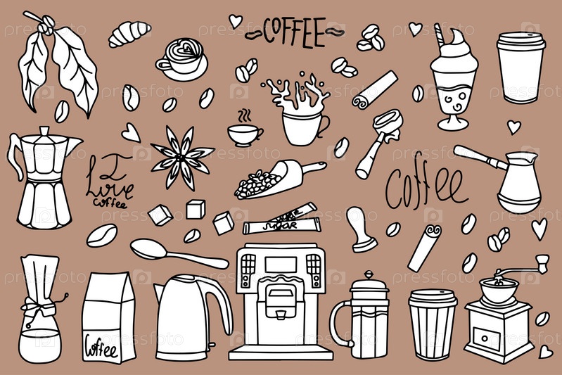 Симпатичные каракули мультяшные иконки кафе. Набор рисованных вручную дизайнов кофе: напитки, закуски и кофейная посуда. Векторный контур рисованной кофе и пекарни для меню кафе
