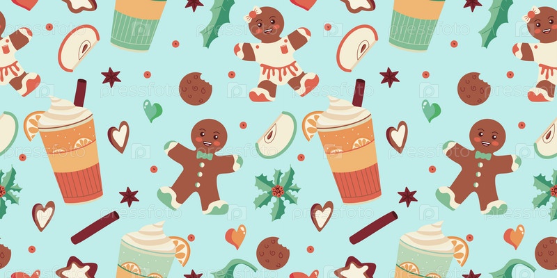 Бесшовный орнамент с зимними угощениями - пряниками, согревающими напитками, специями. Ручной рисунок рождественских и новогодних элементов для дизайнерской оберточной бумаги. Векторная иллюстрация
