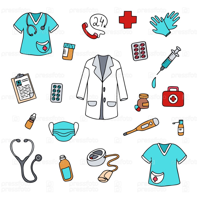 Ручные медицинские и медицинские рисунки. Здравоохранение, аптека, коллекция медицинских икон. Векторная иллюстрация