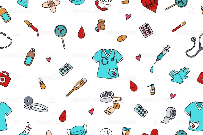 Бесшовный рисунок с лекарствами, диагностическими и лечебными предметами. Векторная ручная иллюстрация в стиле каракулей. Аптечка первой помощи. Оборудование для аптек и больниц.Векторная иллюстрация