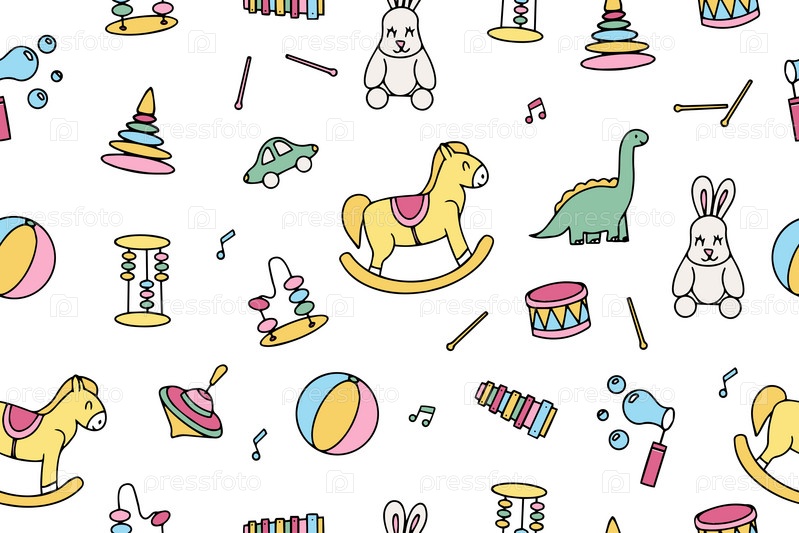 Бесшовный узор в стиле каракулей из детских игрушек. Яркие игрушки в стиле каракулей. Векторная иллюстрация. Вектор