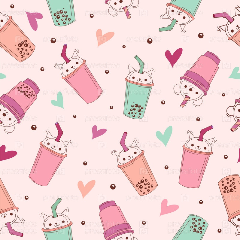 Бесшовный фон из чашек для напитков. Чай, безалкогольные напитки в пластиковых стаканчиках, модный десерт, красочная векторная коллекция