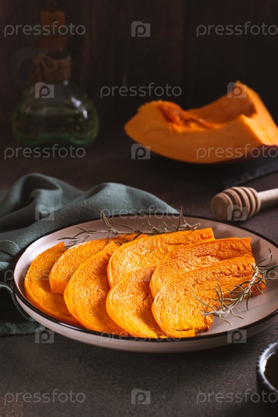 Домашние запеченные кусочки тыквы с розмарином на тарелке на столе, вертикальный вид