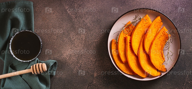Сезонное вегетарианское блюдо, нарезанная запеченная тыква с травами на тарелке, вид сверху, веб-баннер