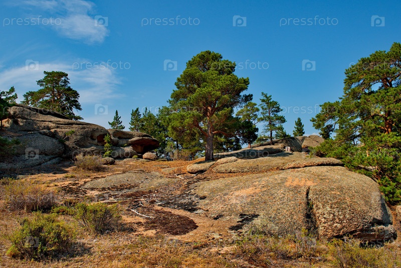 Восточный Казахстан. Живописный вид на каменные останцы горного природного парка Баянаул, расположенного посреди бескрайних степей