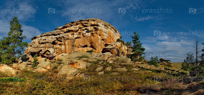 Восточный Казахстан. Живописный вид на каменные останцы горного природного парка Баянаул, расположенного посреди бескрайних степей
