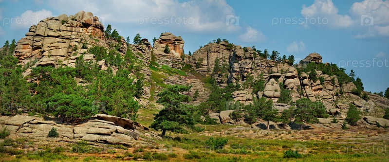 Восточный Казахстан. Живописный вид на каменные останцы горного природного парка Баянаул, расположенного посреди бескрайних степей