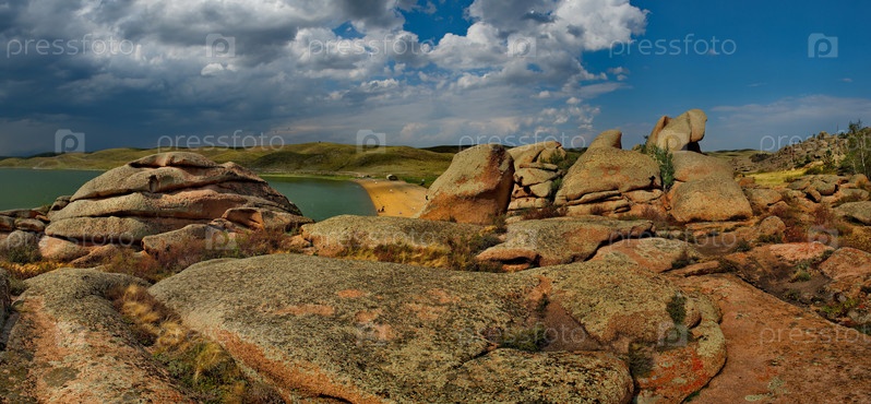 Восточный Казахстан. Живописный вид на каменные останцы горного природного парка Баянаул, расположенного посреди бескрайних степей