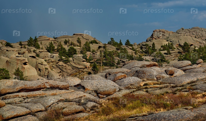 Восточный Казахстан. Живописный вид на каменные останцы горного природного парка Баянаул, расположенного посреди бескрайних степей