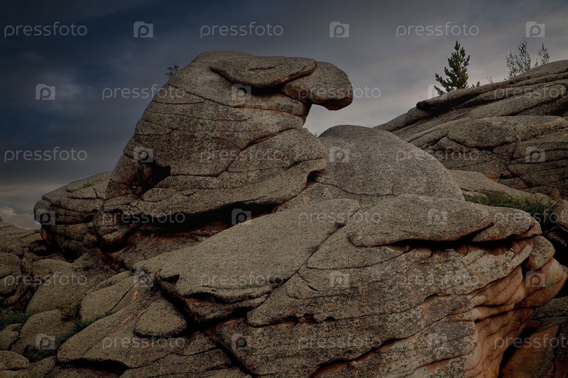 Восточный Казахстан. Живописный вид на каменные останцы горного природного парка Баянаул, расположенного посреди бескрайних степей