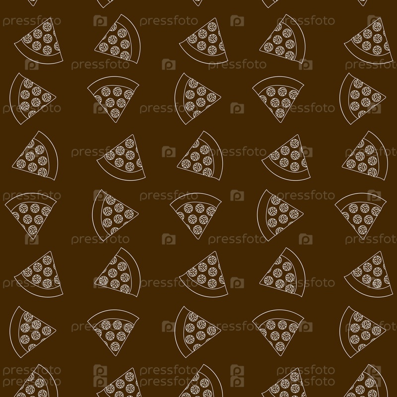 Бесшовный узор с ломтиками пиццы пепперони с белым контуром на коричневом фоне