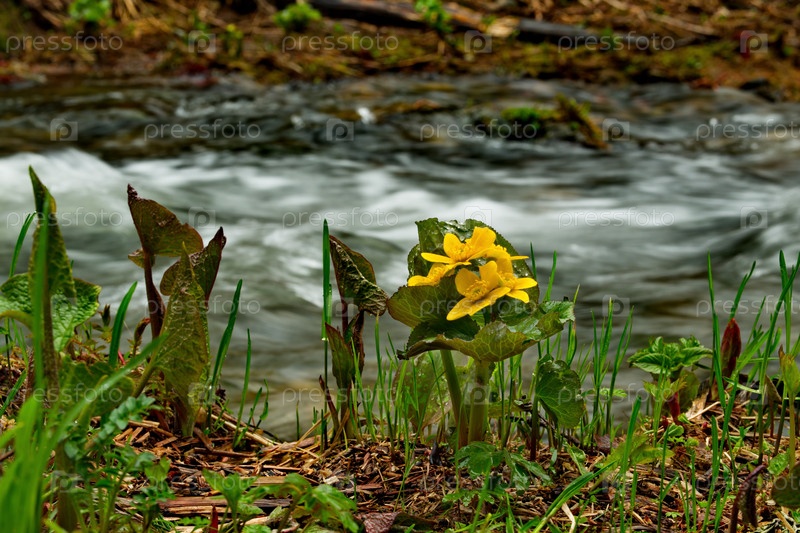 Россия. Кузнецкий Алатау. Первые весенние всходы таежных цветов на берегу притока реки Томь