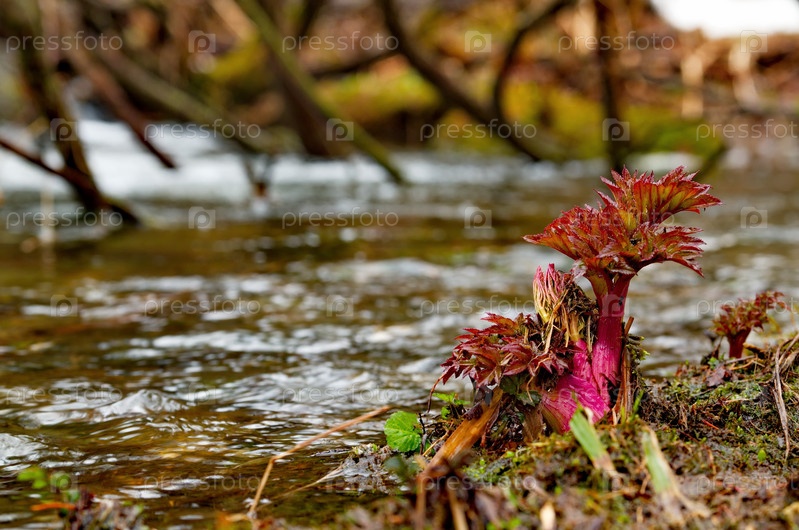 Россия. Кузнецкий Алатау. Первые весенние всходы таежных цветов на берегу притока реки Томь