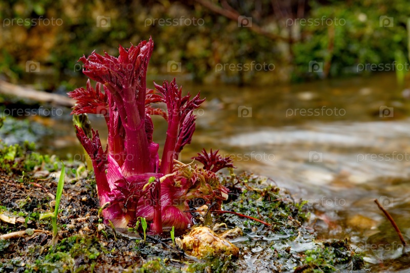 Россия. Кузнецкий Алатау. Первые весенние всходы таежных цветов на берегу притока реки Томь
