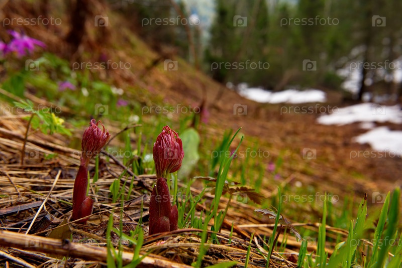 Россия. Кузнецкий Алатау. Первые весенние всходы таежных цветов на берегу притока реки Томь