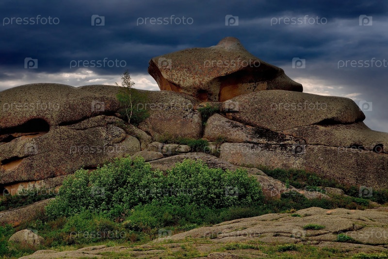 Восточный Казахстан. Живописный вид на каменные останцы горного природного парка Баянаул, расположенного посреди бескрайних степей