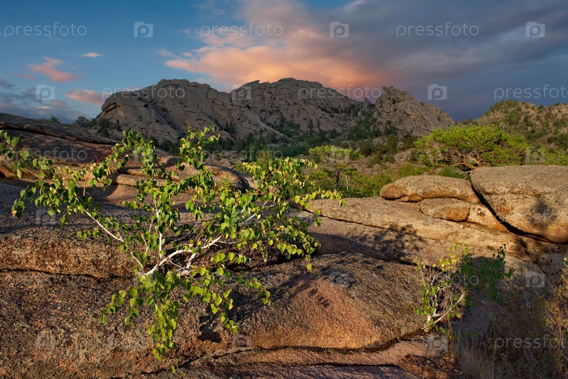 Восточный Казахстан. Живописный вид на каменные останцы горного природного парка Баянаул, расположенного посреди бескрайних степей