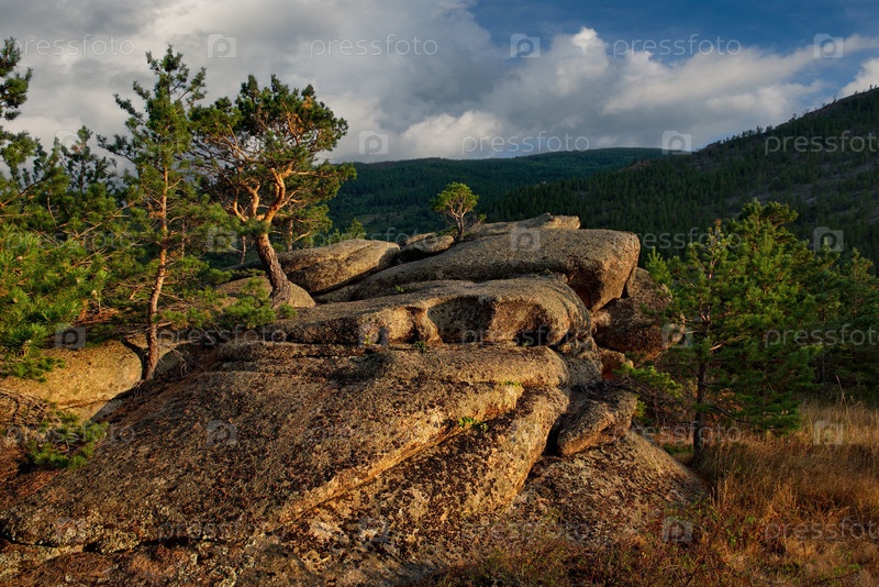 Восточный Казахстан. Живописный вид на каменные останцы горного природного парка Баянаул, расположенного посреди бескрайних степей