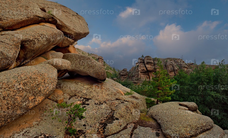 Восточный Казахстан. Живописный вид на каменные останцы горного природного парка Баянаул, расположенного посреди бескрайних степей
