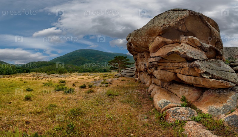 Восточный Казахстан. Живописный вид на каменные останцы горного природного парка Баянаул, расположенного посреди бескрайних степей