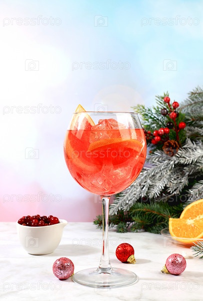 Рождественский алкогольный коктейль Aperol spritz в стаканах на праздничном фоне с ветвями елки и украшениями, концепция бара и канун Нового года, спиртные напитки на вечеринке, избирательный фокус