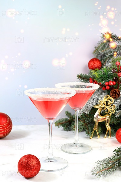 Рождественский алкогольный коктейль с красным мартини, лимонадом, шампанским в бокалах на праздничном фоне с еловыми ветками и украшениями, концепция бара, алкогольные напитки на вечеринке, избирательный фокус